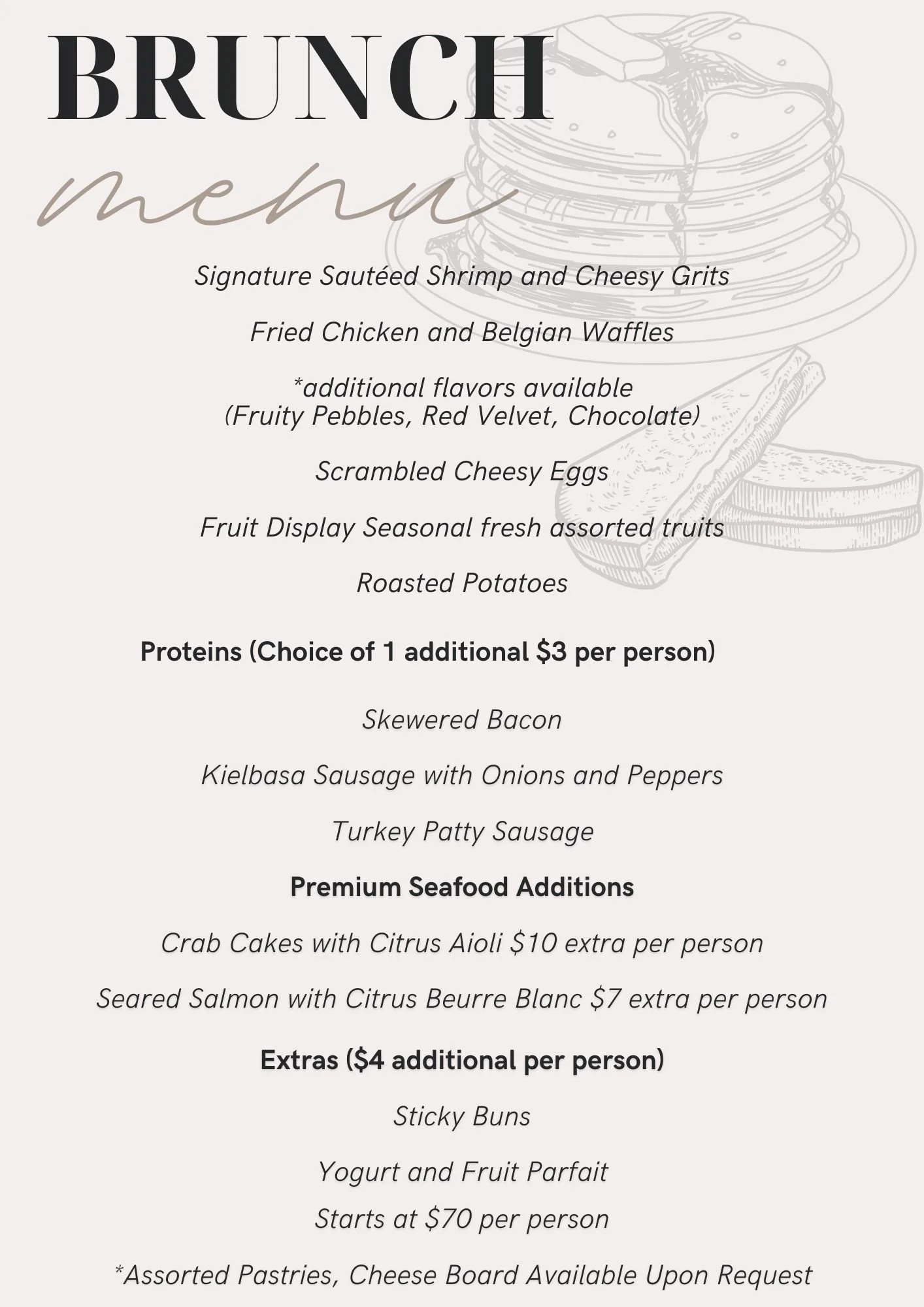 Starting at $70 Per Person, Buffet Style with complementary orange juice, cranberry juice and water